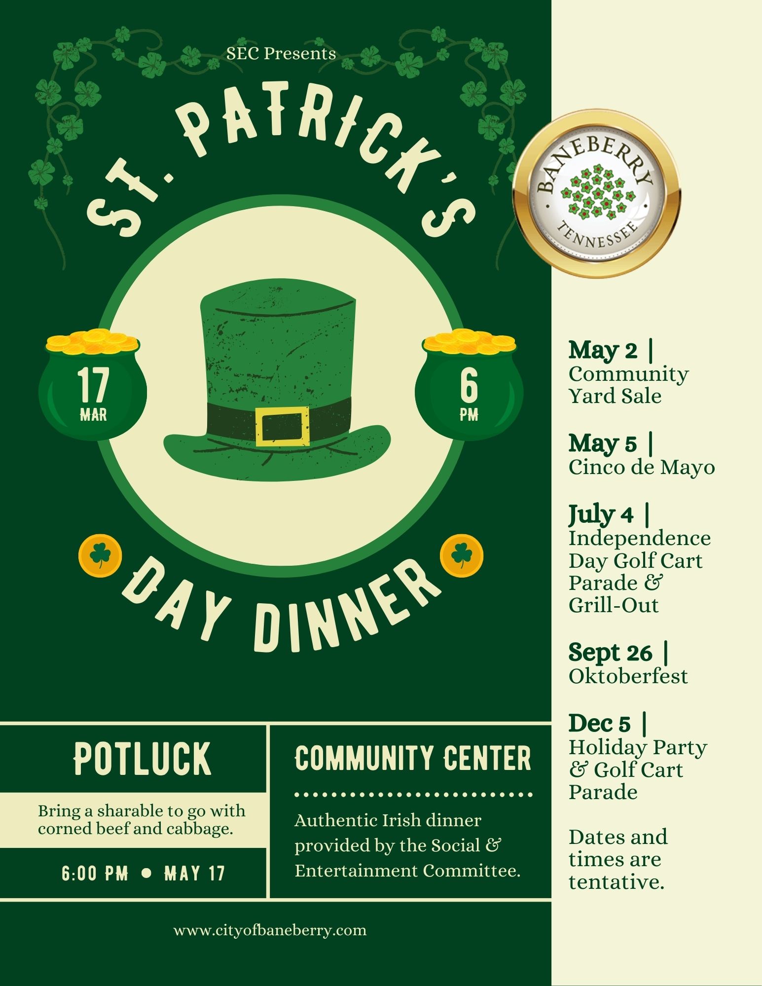 Dates and times are tentative. Flyers are hung outside the City Office/Community Center and the Mail Center. FOLLOW US on Facebook.
