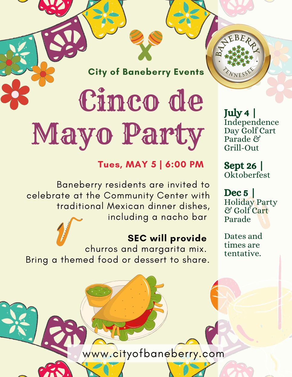 Residents are invited to the Community Center for a Cinco de Mayo, Mexican, International Food Night.